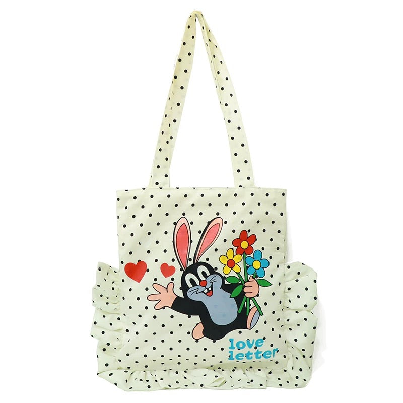 The bag depicts The Little Mole holding a bouquet of colorful flowers, with red heart illustrations and the text "love letter" printed on a light green and white checkered background. It also has ruffled details on the sides.